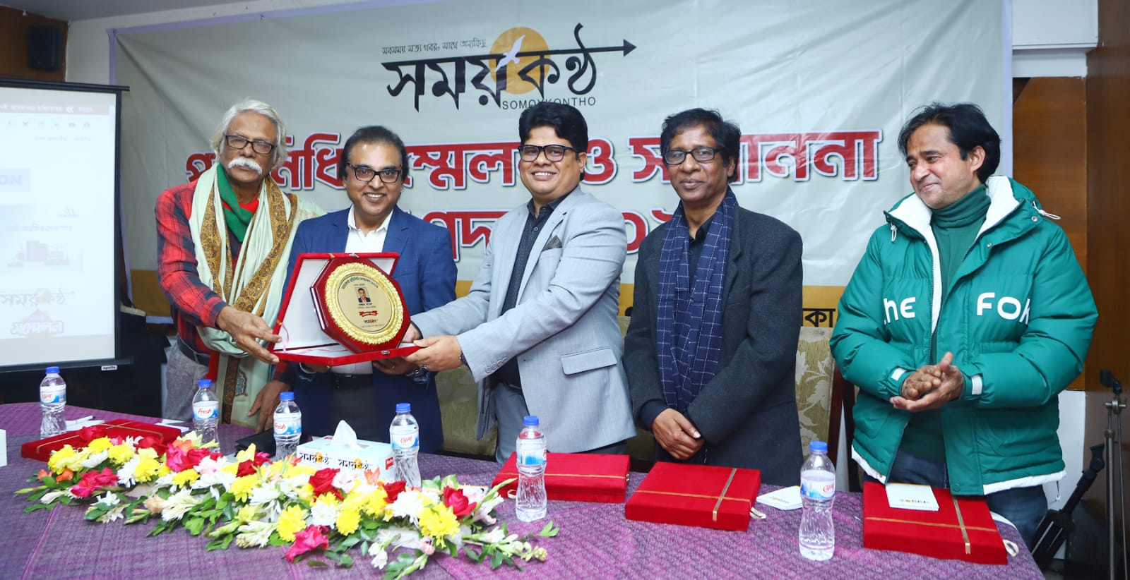 সময়কন্ঠ অনলাইন সংবাদপত্রর প্রতিনিধি সম্মেলন ও সম্মাননা স্মারক ২০২৫, প্রদান অনুষ্ঠানে প্রধান অতিথি দৈনিক খবরের কাগজ সম্পাদক বিশিষ্ট কথা সাহিত্যিক মোস্তফা কামালকে শুভেচ্ছা স্মারক প্রদান করেন সময়কণ্ঠ সম্পাদক ও প্রকাশক মো. আব্দুল করিম৷
