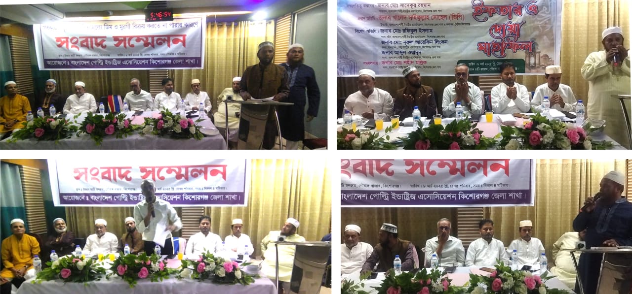 সরকার নির্ধারিত মূল্যে ডিম-মুরগী বিক্রয় করতে না পারায় কিশোরগঞ্জের কয়েকশত খামারি সংবাদ সম্মেলন করেছেন। শনিবার বিকেলে জেলা শহরের উজান ভাটি রেস্টুরেন্টের হল রুমে এ সংবাদ সম্মেলনের আয়োজন করে কিশোরগঞ্জ পোল্ট্রি ইন্ডাস্ট্রি অ্যাসোসিয়েশন। এতে লিখিত বক্তব্য রাখেন বাংলাদেশ পোল্ট্রি ইন্ডাস্ট্রিজ অ্যাসোসিয়েশন কিশোরগঞ্জ জেলা শাখার আহ্বায়ক মুহাম্মদ সাদেকুর রহমান সাদেক। সংবাদ সম্মেলনে সংহতি প্রকাশ করে প্রধান অতিথির বক্তব্য রাখেন বাংলাদেশ পোল্ট্রি ইন্ডাস্ট্রিজ অ্যাসোসিয়েশনের উপদেষ্টা কিশোরগঞ্জ সদর উপজেলা বিএনপির সভাপতি সাবেক ভিপি খালেদ সাইফুল্লাহ সোহেল। বিশেষ অতিথি ছিলেন কিশোরগঞ্জ প্রেসক্লাবের সভাপতি একে নাসিম খান,সাধারণ সম্পাদক সাইফুল মালেক চৌধুরী,সহ সাধারণ সম্পাদক মুনিরুজ্জামান খান চৌধুরী সোহেল,কোশাধ্যক্ষ অধ্যাপক শফিকুল ইসলাম ফকির মতি। বাংলাদেশ পোল্ট্রি ইন্ডাস্ট্রিজ অ্যাসোসিয়েশন কিশোরগঞ্জ জেলা শাখার সদস্য মো.শহিদ মল্লিকের পরিচালনায় অন্যান্যদের মধ্যে বক্তব্য রাখেন, সংগঠনের সদস্য সচিব মুহাম্মদ রফিকুল ইসলাম,বাংলাদেশ পোল্ট্রি ইন্ডাস্ট্রিজ অ্যাসোসিয়েশনের সদস্য আব্দুল ওয়াদুদ, জাতীয় যুব পদকপ্রাপ্ত খামারি মো. নুরুল আরেফিন লিংকন, খামারি হাফেজ মাও রাশিদ আহমেদ,সংগঠনের পাকুন্দিয়া উপজেলা শাখার আহ্বায়ক কামাল উদ্দিন ছোটন প্রমুখ।