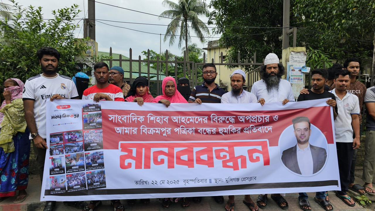 মুন্সিগঞ্জের স্থানীয় সংবাদভিত্তিক অনলাইন পত্রিকা ‘আমার বিক্রমপুরে’র সম্পাদক শিহাব আহমেদের বিরুদ্ধে অপপ্রচারের অভিযোগ এনে পত্রিকাটি বন্ধের হুমকির প্রতিবাদে মানববন্ধন কর্মসূচি পালিত হয়েছে।বৃহস্পতিবার বেলা ১১ টার দিকে মুন্সিগঞ্জ প্রেসক্লাবের সামনে মানববন্ধনে অংশ নেয় মুন্সিগঞ্জের জুলাই শহিদ পরিবার ও আহত গেজেটেড জুলাই যোদ্ধাবৃন্দ।এতে বিভিন্ন বয়সী অর্ধশতাধিক শিক্ষার্থী ও নারী পুরুষ অংশ নেন।
