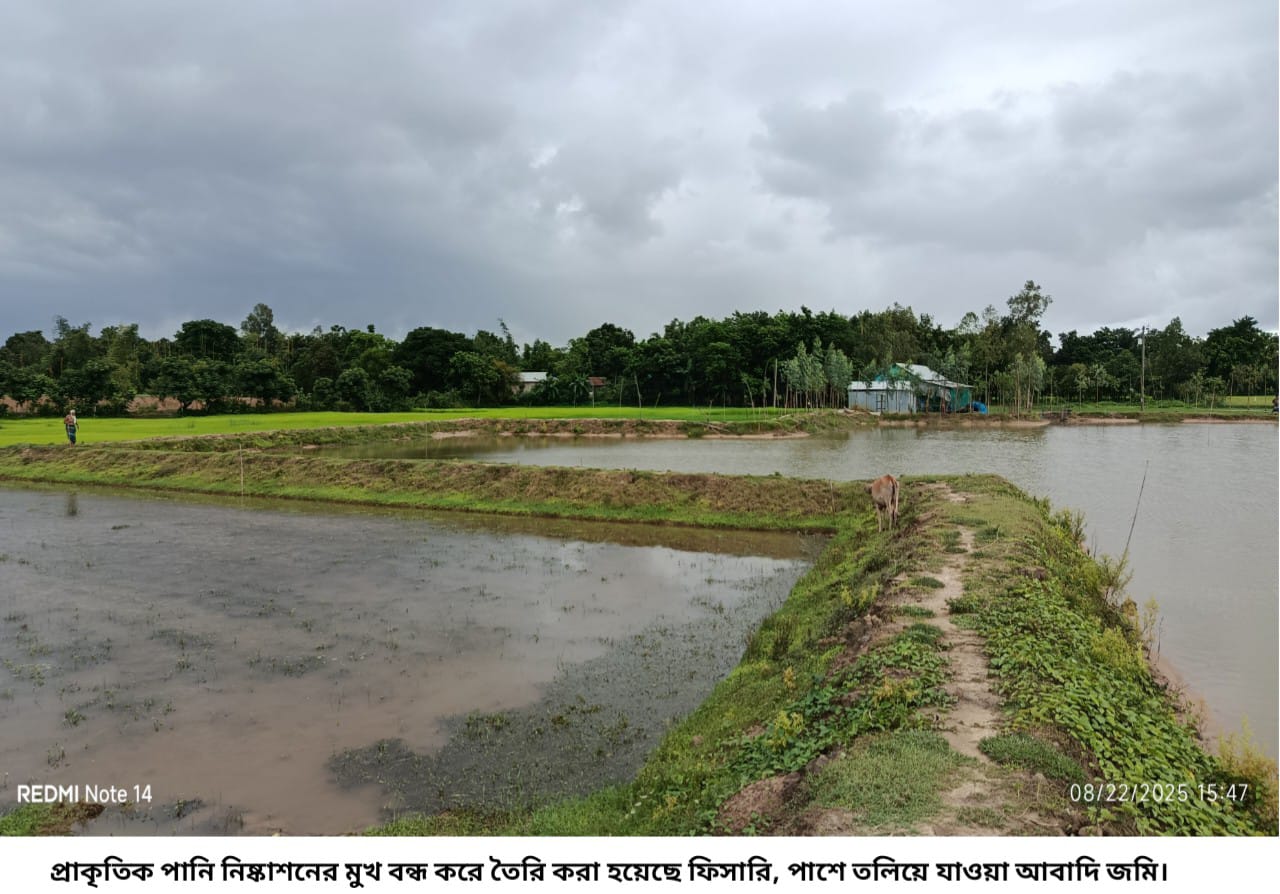 ভুক্তভোগী মো. মিরাজ আলী গং-এর গণ স্বাক্ষরিত অভিযোগে বলা হয়, অভিযুক্তরা পানি নিষ্কাশনের মুখ বন্ধ করে দেওয়ায় শুধু আবাদি জমিই নয়, বহু বাড়িঘরের উঠানেও পানি ঢুকে পড়েছে। এতে এলাকার আমন ধানের বীজতলা নষ্ট হওয়ার উপক্রম হয়েছে।