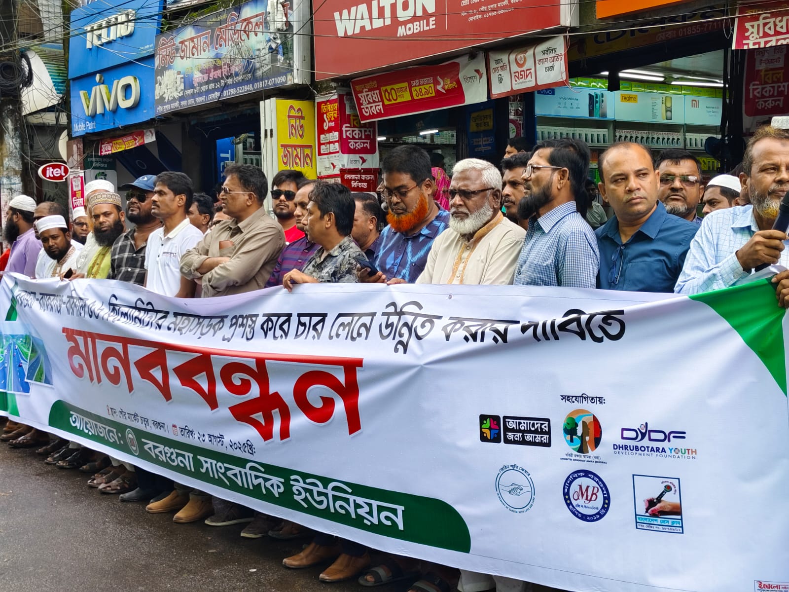 বরগুনা-বাকেরগঞ্জ আঞ্চলিক মহাসড়কটি চার লেনে উন্নীতকরণের দাবিতে বরগুনায় মানববন্ধন অনুষ্ঠিত। বরগুনা সাংবাদিক ইউনিয়নের আয়োজনে আজ শনিবার (২৩ আগস্ট) বেলা ১১টায় বরগুনা পৌরমার্কেট প্রাঙ্গণে এ মানববন্ধন অনুষ্ঠিত হয়।
