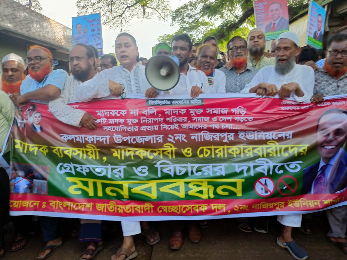 বুধবার বিকেলে নাজিরপুর বাজারে ঘণ্টাব্যাপী এই মানববন্ধনে বিক্ষুব্ধ এলাকাবাসী ছাড়াও বিভিন্ন শ্রেণি-পেশার প্রায় দুই সহস্রাধিক মানুষ অংশ নেন। পরে সেখান থেকে একটি বিক্ষোভ মিছিল বের হয়ে বাজারের বিভিন্ন সড়ক প্রদক্ষিণ করে। মিছিল থেকে মাদক, চোরাচালান ও চাঁদাবাজি বন্ধের দাবিতে বিভিন্ন স্লোগান দেওয়া হয়।