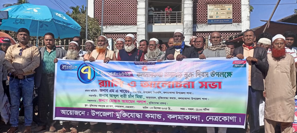 নেত্রকোনার কলমাকান্দায় ঐতিহাসিক ৭ ডিসেম্বর হানাদার মুক্ত দিবস উপলক্ষ্যে র্যালি ও আলোচনা সভা অনুষ্ঠিত হয়েছে। রোববার (৭ ডিসেম্বর) সকাল ১১টায় কলমাকান্দা উপজেলা মুক্তিযোদ্ধা কমপ্লেক্সের তৃতীয় তলায় এ কর্মসূচি পালন করা হয়।