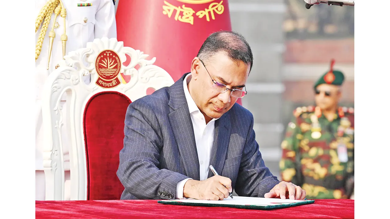 বাংলাদেশের ১৭তম (ব্যক্তি হিসেবে ১১তম) প্রধানমন্ত্রী হিসেবে শপথ নিয়েছেন বিএনপি চেয়ারম্যান তারেক রহমান। তার নেতৃত্বে দুই দশক পর রাষ্ট্রক্ষমতায় ফিরল বিএনপি। এবারই দীর্ঘদিনের ঐতিহ্য ভেঙে গতকাল মঙ্গলবার বিকেলে বঙ্গভবনের পরিবর্তে জাতীয় সংসদ ভবনের দক্ষিণ প্লাজায় শপথ গ্রহণ অনুষ্ঠান হয়। এক জাঁকজমকপূর্ণ অনুষ্ঠানে রাষ্ট্রপতি মো. সাহাবুদ্দিন নবনিযুক্ত প্রধানমন্ত্রী ও তার মন্ত্রিসভার সদস্যদের শপথবাক্য পাঠ করান। মন্ত্রিপরিষদ সচিব ড. নাসিমুল গণি শপথ গ্রহণ অনুষ্ঠান সঞ্চালনা করেন। এর আগে সকাল সাড়ে ১০টার দিকে নবনির্বাচিত সংসদ সদস্যদের শপথ পড়ান প্রধান নির্বাচন কমিশনার (সিইসি) এ এম এম নাসির উদ্দীন।